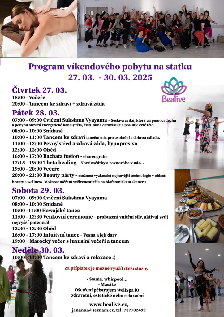 Můžete se těšit na různé taneční styly, cvičení pro zdravá záda a pevný střed, Jógu, Naam meditace s jemným protažením, Esence Théta healingu, cvičení Sukshma Vyayama, přednášky, večerní taneční show a párty…
